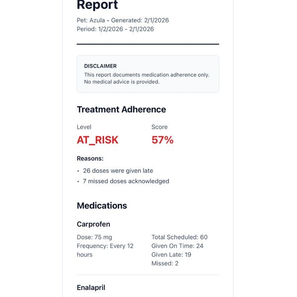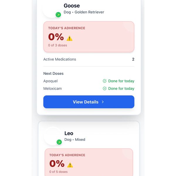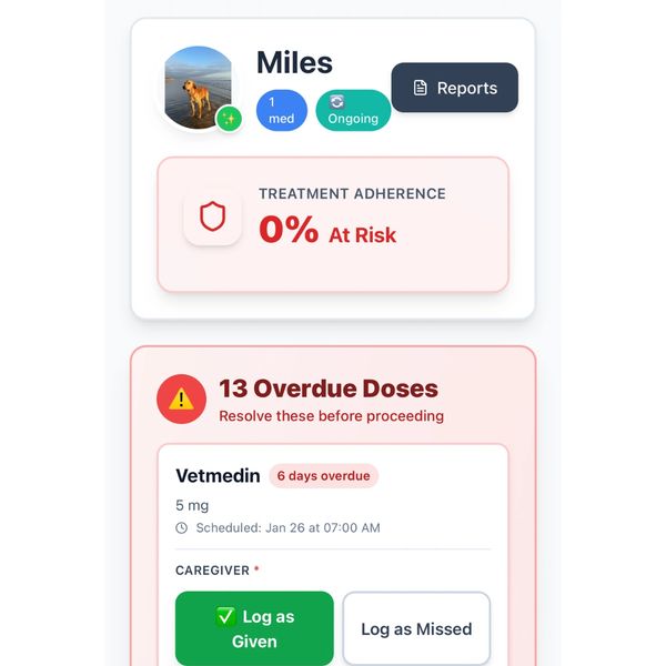 Manage medication schedules for multiple pets with ease. Each pet gets their own regimen and credibility tracking.